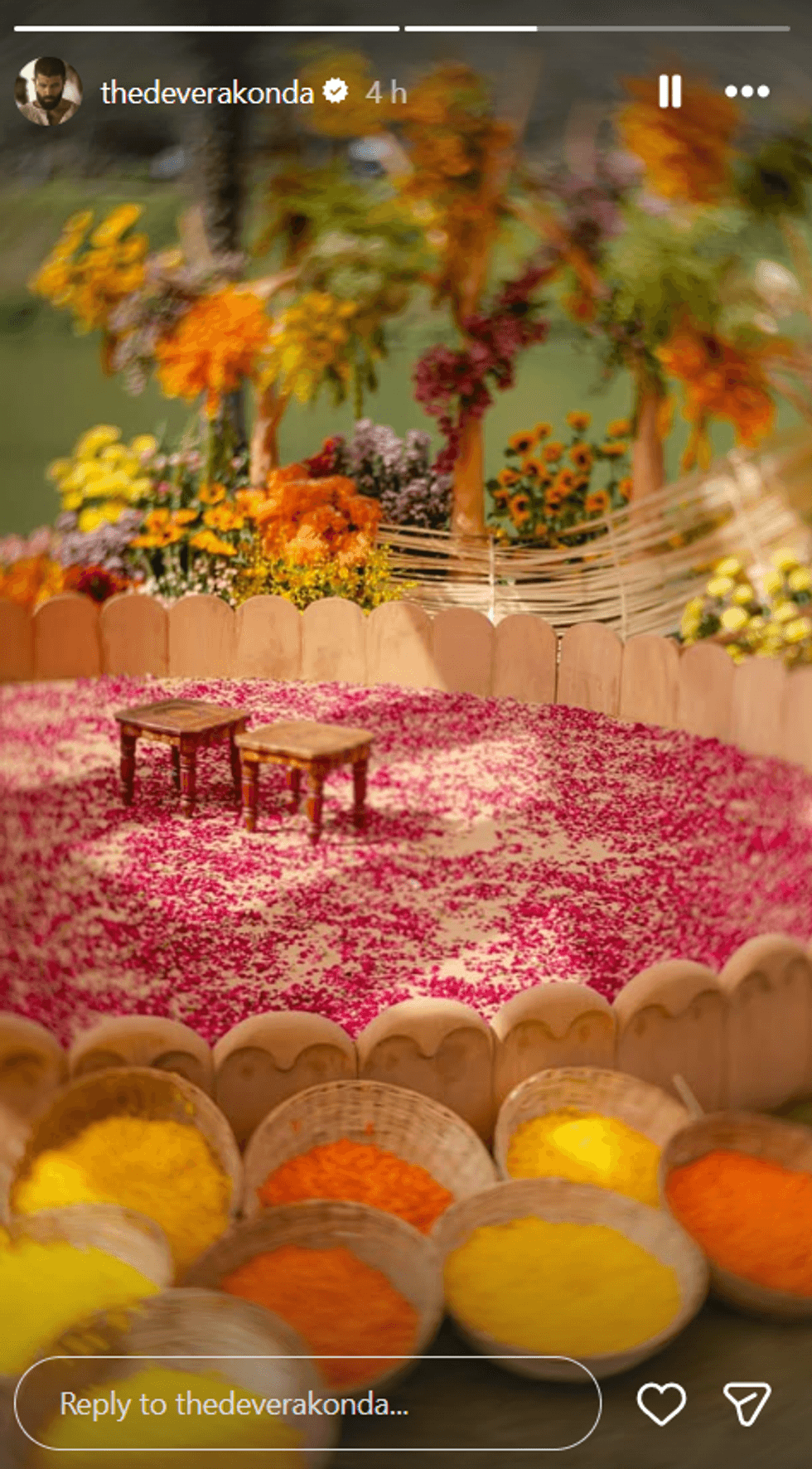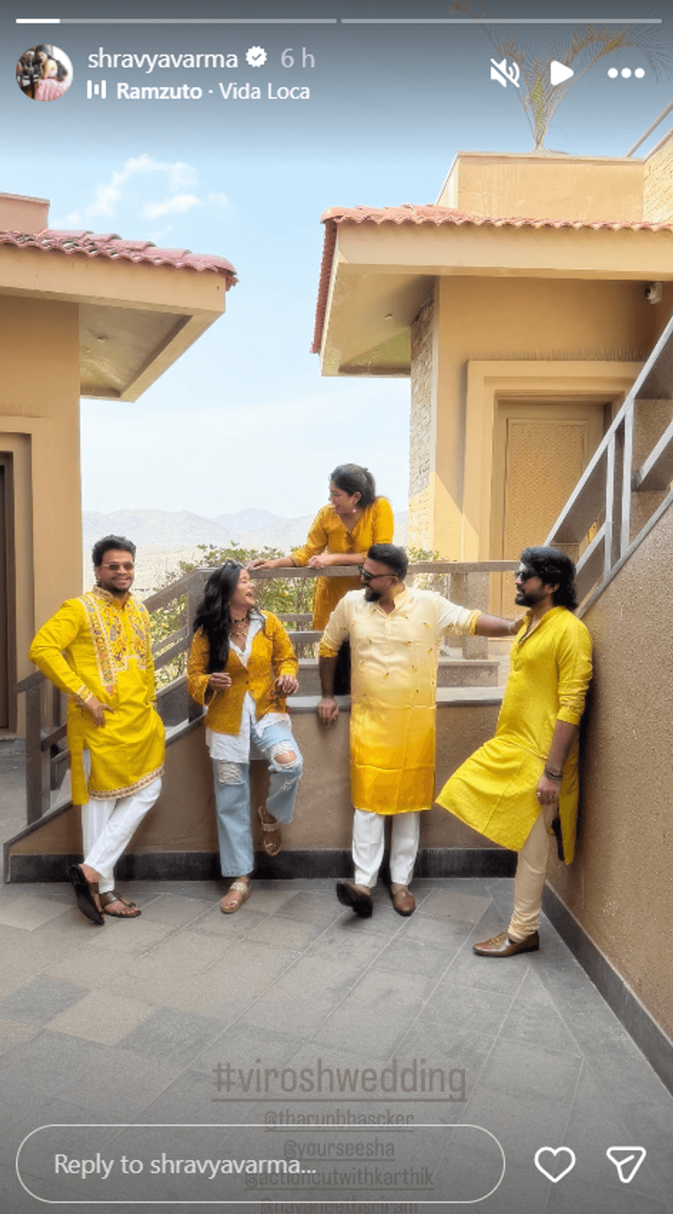 The celebrations began with what insiders referred to as the “Virosh Premier League” a playful pre-wedding event referencing the couple’s popular fan-given nickname, “Virosh.” Following the sangeet, the haldi and mehendi ceremonies took place Wednesday, with guests dressed in shades of yellow for the traditional turmeric ritual. Stylist Shravya Varma shared a group photo from the haldi ceremony featuring director-actor Tharun Bhascker, actor Eesha Rebba, and other guests dressed in coordinated yellow outfits.